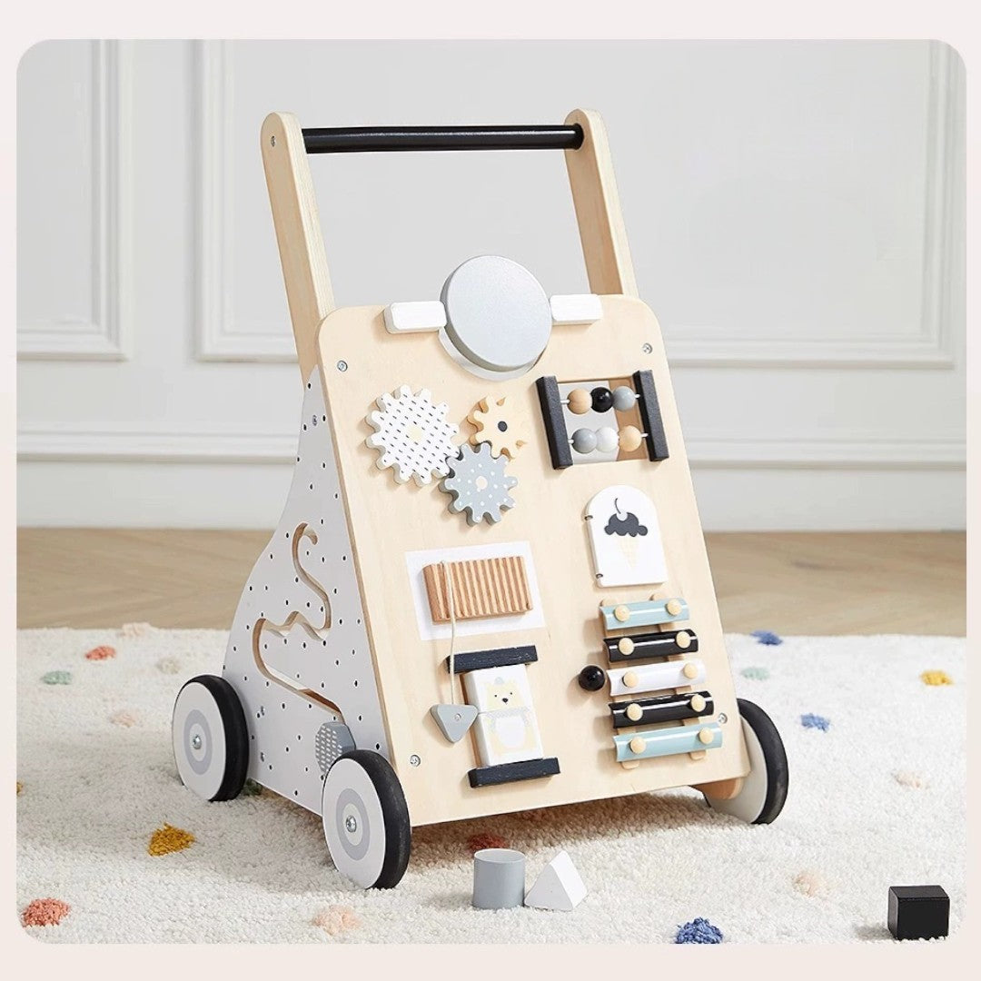 Asweets 實木多功能嬰兒學步車 (益智款) - 陪伴寶寶穩健邁出第一步當寶寶進入學步期,一台安全且具備啟蒙功能的學步車是成長路上的最佳夥伴。Asweets 實木多功能嬰兒學步車專為幼兒設計,結合了物理力學安全結構與蒙特梭利教育理念,不僅能輔助寶寶練習行走,更能透過豐富的益智面板,全方位開發手眼協調與認知能力。請注意:因速遞服務所限,運送地址必須為住宅或工商地址,不接受智能櫃取件。核心安全設計我們深知家長對安全的要求,這款學步車在結構上進行了多重優化,確保寶寶在探索過程中穩如泰山。 項目 規格/功能描述 專利穩固結構 採用低重心金字塔三角力學設計,配合四輪穩固支撐,有效防側翻、防翻車。 科學防 O 型腿 32cm 加寬踏板間距,符合人體工學,行走時不夾腿,引導正確步態。 後輪可調速功能 360° 乳膠防滑輪,可透過扭緊螺絲調節阻力,適應寶寶不同階段的學步速度。 人體工學扶手 高度適中,方便寶寶緊握,增加行走時的安全感與平衡感。 🔧 組裝難易度:中等 (需由成人使用內附工具進行簡易組裝,適合親子共建)多功能益智面板:邊走邊玩,啟發潛能這不只是一台學步車,更是一個移動的遊戲中心。面板上集成了多種互動機關,讓寶寶在休息時也能專注於感官訓練。 益智模組 教育意義與玩法 五音符手敲琴 激發音樂興趣,培養聽覺節奏感與手部敲擊力度控制。 珠子迷宮與軌道 鍛鍊手指精細動作,提升空間感與手眼協調能力。 旋轉齒輪 理解連動邏輯,觀察物理因果關係。 圖形配對與數字積木 訓練「數量—形狀」對應思維,建立基礎數理與色彩認知。 模擬電話 角色扮演啟蒙,增進語言表達與社交想像力。 嚴選材質與工藝產品選用優質天然木材,觸感溫潤,遠離塑膠玩具的冰冷感,為寶寶提供最自然的成長環境。 材質/細節 規格說明 木材成分 荷木 + 歐洲櫸木 + 美國椴木複合材,結構堅固耐用。...$19.99